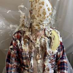 Messy_charlie was surprised by Chuck M with a big sloppy cream pie to the face